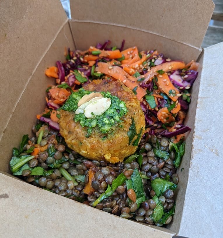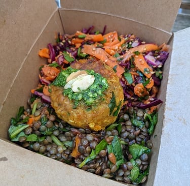 Lentilles vertes, patates douces rôties dans des épices, jeunes pousses d'épinards, sauce harissa citronnée