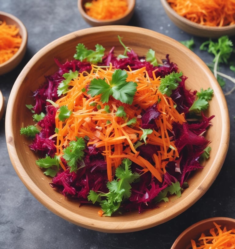 Carottes et choux rouges râpés, persil, sauce sésame et piment de Cayenne